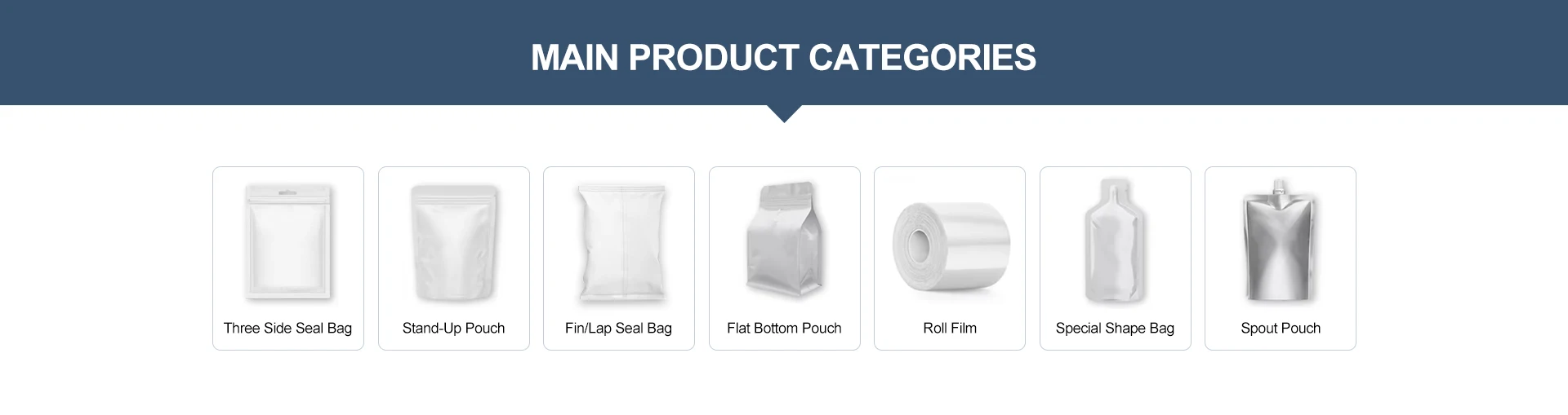 Основные продукты:Пищевой ламинированный мешочек, стоячий мешочек на молнии, боковые насадок, трехсторонний уплотнительный мешочек, рулонная пленка